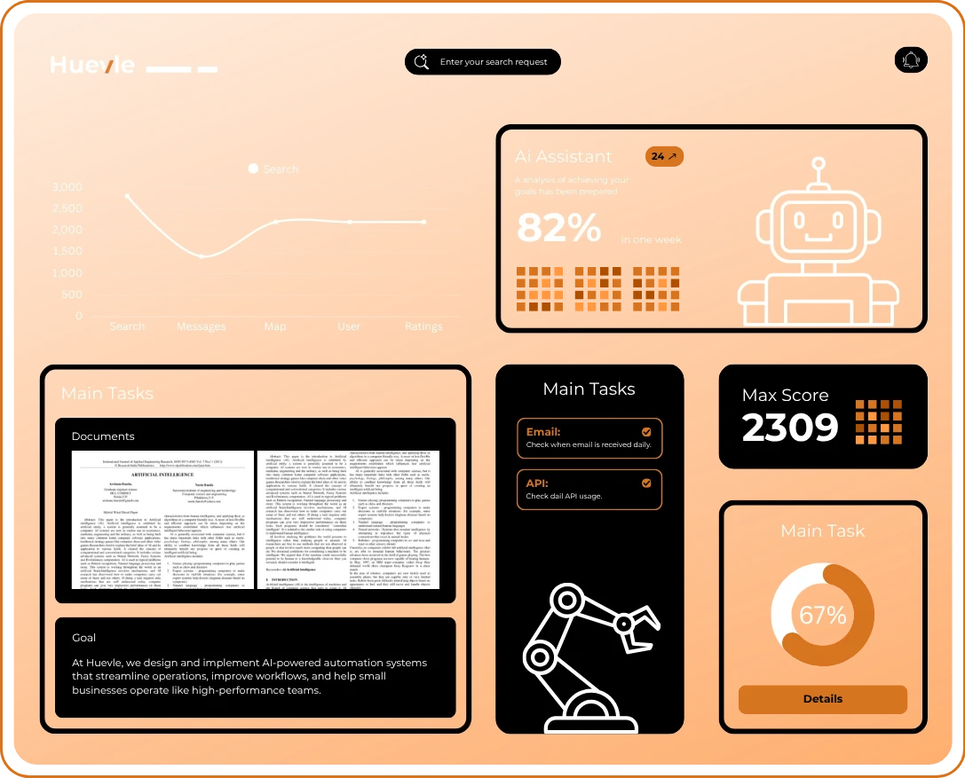 Work smarter. Reduce manual tasks. Increase efficiency. At Huevle, we design and implement AI-powered automation systems that streamline operations, improve workflows, and help small businesses operate like high-performance teams.